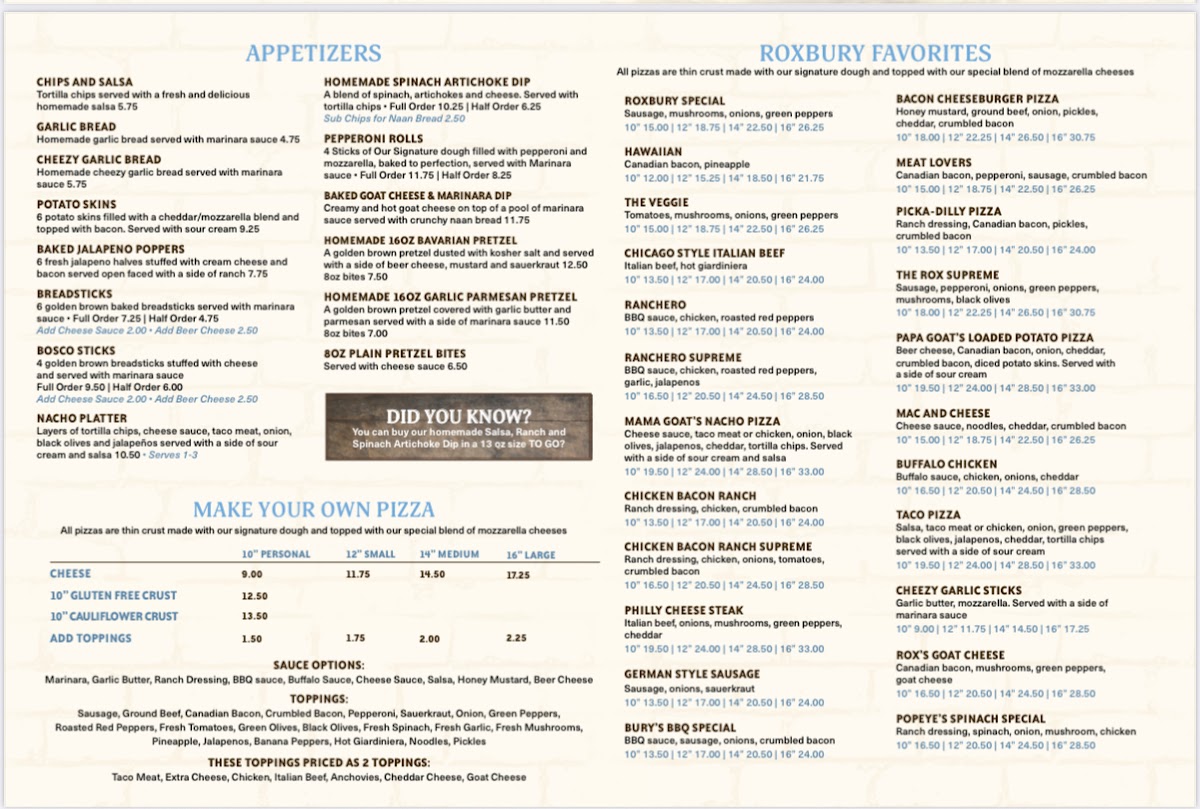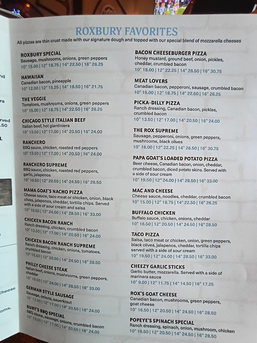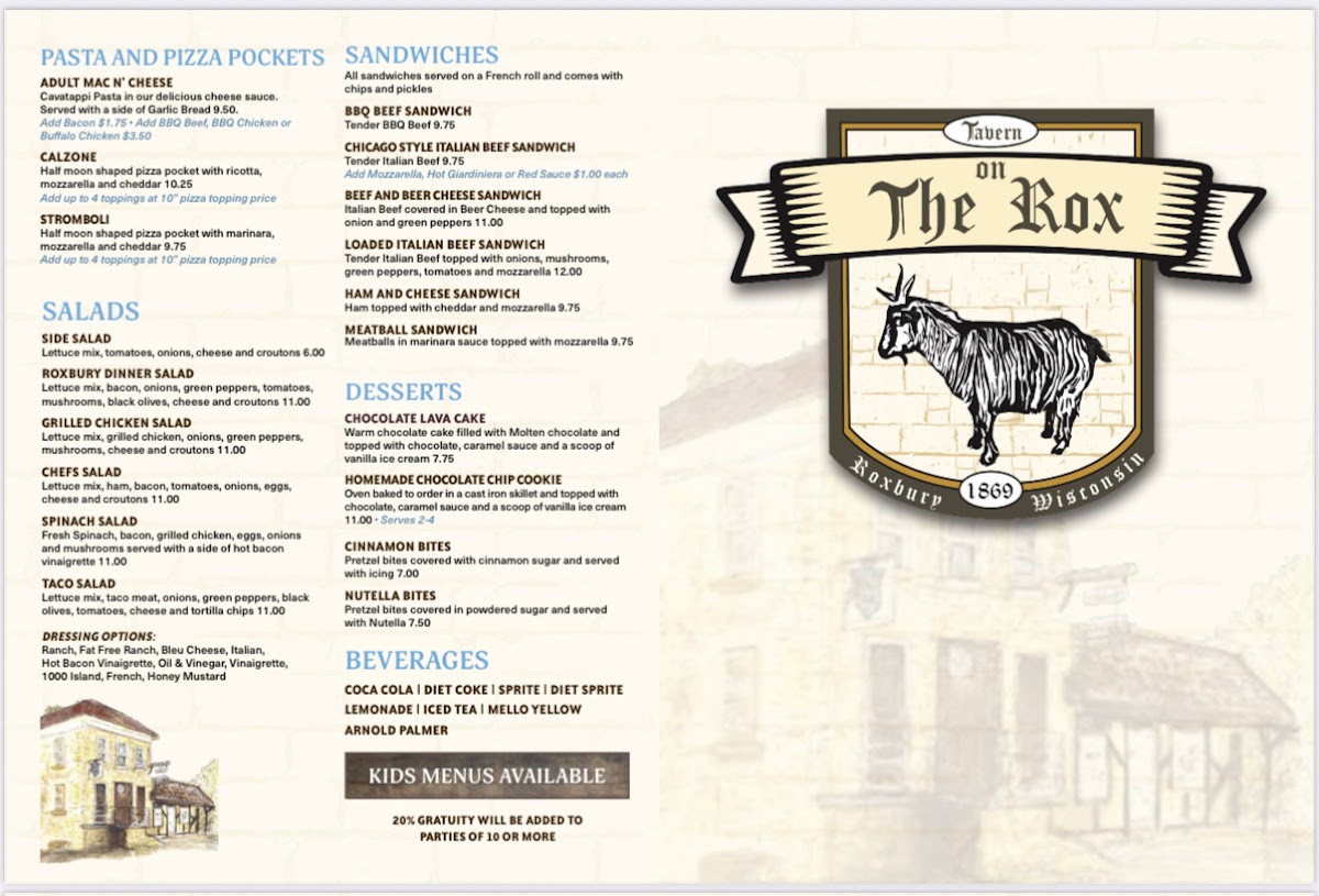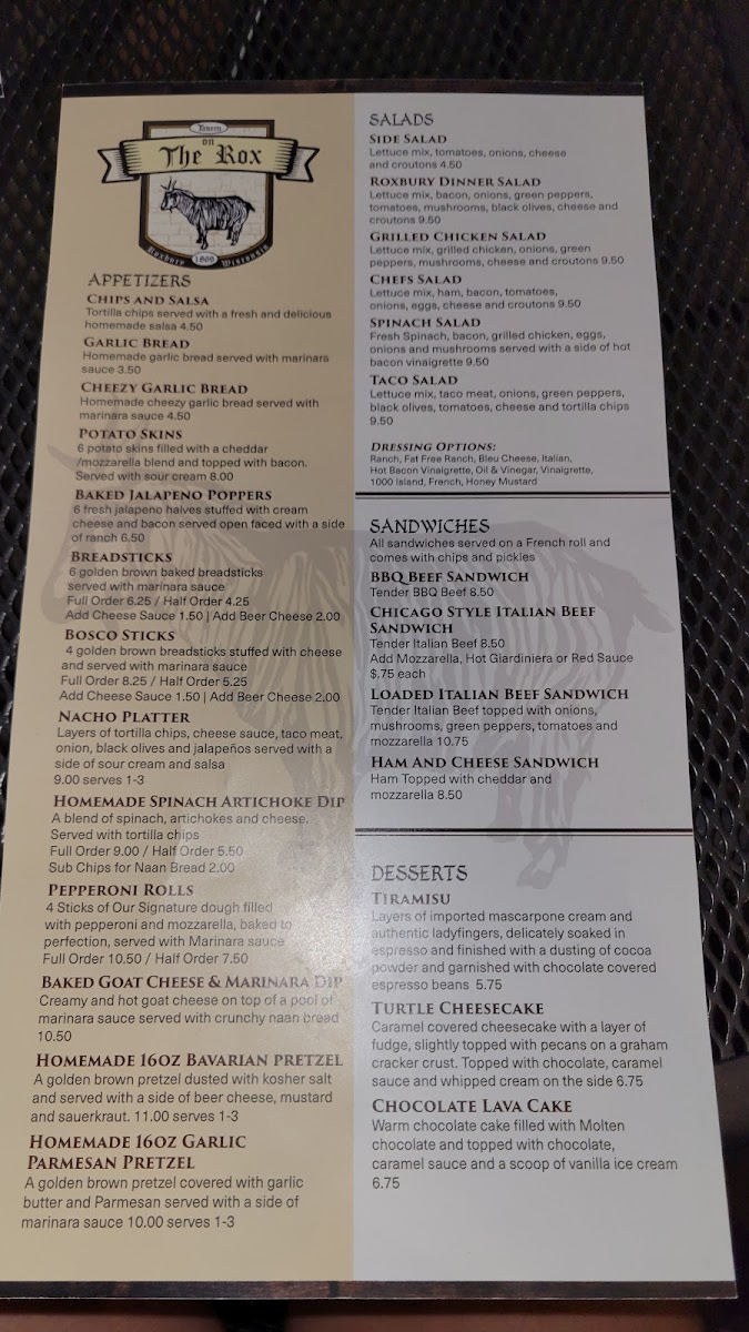 From a reviewer’s perspective, the menu at On The Rox feels like a confident wrap-up of everything the restaurant does well-comfort food with personality, balanced by approachable drinks and classic desserts. The experience often begins with shareable starters like Chips And Salsa, Garlic Bread, Cheezy Garlic Bread, Potato Skins, and Baked Jalapeno Poppers, which set a casual, welcoming tone. The heart of the menu shines in the Roxbury Favorites, where options such as Roxbury Special, Hawaiian, The Veggie, Chicago Style Italian Beef, and Ranchero showcase bold, familiar flavors that clearly anchor the kitchen’s identity. Lighter but still satisfying choices appear in the salad section, including Side Salad, Roxbury Dinner Salad, Grilled Chicken Salad, Chefs Salad, and Spinach Salad, offering balance for diners who want something fresh alongside heartier fare. Sandwich lovers are well covered with choices like Bbq Beef Sandwich, Chicago Style Italian Beef Sandwich, Loaded Italian Beef Sandwich, and Ham And Cheese Sandwich, all reinforcing the restaurant’s comfort-driven approach. For those craving something extra filling, Adult Mac N' Cheese, Calzone, and Stromboli round out the pasta and pizza pocket offerings with indulgent appeal. Desserts such as Tiramisu, Turtle Cheesecake, and Chocolate Lava Cake provide a satisfying finish, while the beverage lineup-from Coca Cola, Diet Coke, Sprite, Diet Sprite, and Lemonade to cocktails like Northwood's Hurricane, Long Island Iced Tea, Tropical Island, Blue Island, Classic Old Fashion, Classic Bloody Mary, Bloody Patron, Weedy Palmer, and Peachy Palmer-adds depth and flexibility to the dining experience. Specialty selections like Original Goat, Raspberry Goat, Blueberry Goat, Cranberry Goat, and after-pizza classics such as Black Russian, White Russian, Blind Russian, Chatty Russian, and Blind Irishman neatly tie everything together, making the menu feel complete, cohesive, and true to the laid-back spirit of On The Rox.
