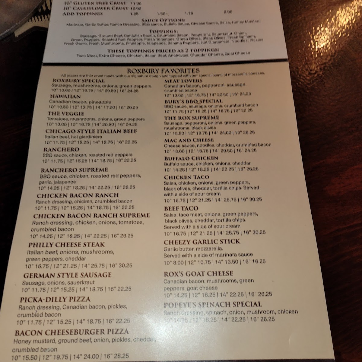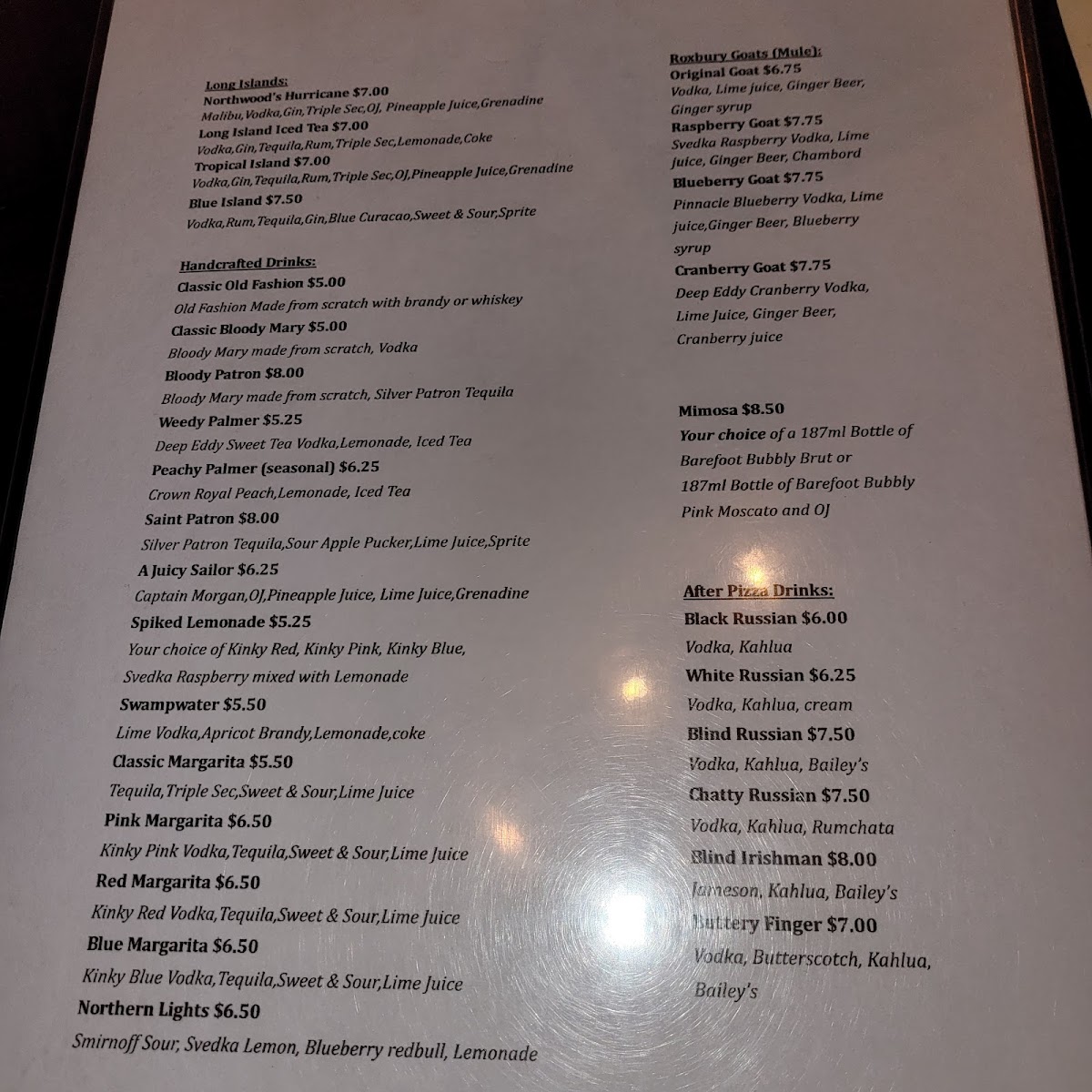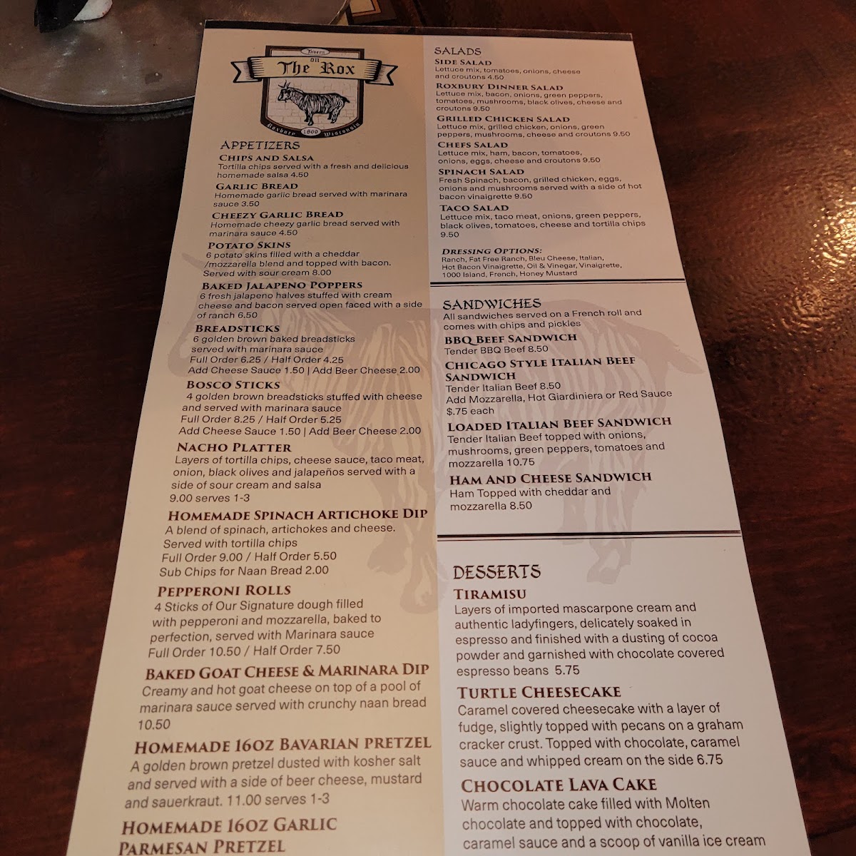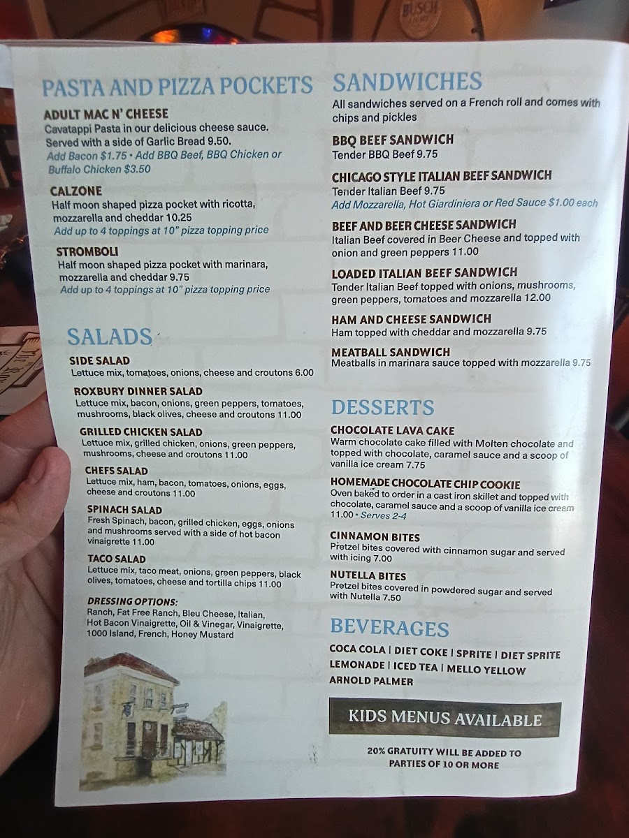From a reviewer’s perspective, the menu at On The Rox feels like a confident wrap-up of everything the restaurant does well-comfort food with personality, balanced by approachable drinks and classic desserts. The experience often begins with shareable starters like Chips And Salsa, Garlic Bread, Cheezy Garlic Bread, Potato Skins, and Baked Jalapeno Poppers, which set a casual, welcoming tone. The heart of the menu shines in the Roxbury Favorites, where options such as Roxbury Special, Hawaiian, The Veggie, Chicago Style Italian Beef, and Ranchero showcase bold, familiar flavors that clearly anchor the kitchen’s identity. Lighter but still satisfying choices appear in the salad section, including Side Salad, Roxbury Dinner Salad, Grilled Chicken Salad, Chefs Salad, and Spinach Salad, offering balance for diners who want something fresh alongside heartier fare. Sandwich lovers are well covered with choices like Bbq Beef Sandwich, Chicago Style Italian Beef Sandwich, Loaded Italian Beef Sandwich, and Ham And Cheese Sandwich, all reinforcing the restaurant’s comfort-driven approach. For those craving something extra filling, Adult Mac N' Cheese, Calzone, and Stromboli round out the pasta and pizza pocket offerings with indulgent appeal. Desserts such as Tiramisu, Turtle Cheesecake, and Chocolate Lava Cake provide a satisfying finish, while the beverage lineup-from Coca Cola, Diet Coke, Sprite, Diet Sprite, and Lemonade to cocktails like Northwood's Hurricane, Long Island Iced Tea, Tropical Island, Blue Island, Classic Old Fashion, Classic Bloody Mary, Bloody Patron, Weedy Palmer, and Peachy Palmer-adds depth and flexibility to the dining experience. Specialty selections like Original Goat, Raspberry Goat, Blueberry Goat, Cranberry Goat, and after-pizza classics such as Black Russian, White Russian, Blind Russian, Chatty Russian, and Blind Irishman neatly tie everything together, making the menu feel complete, cohesive, and true to the laid-back spirit of On The Rox.